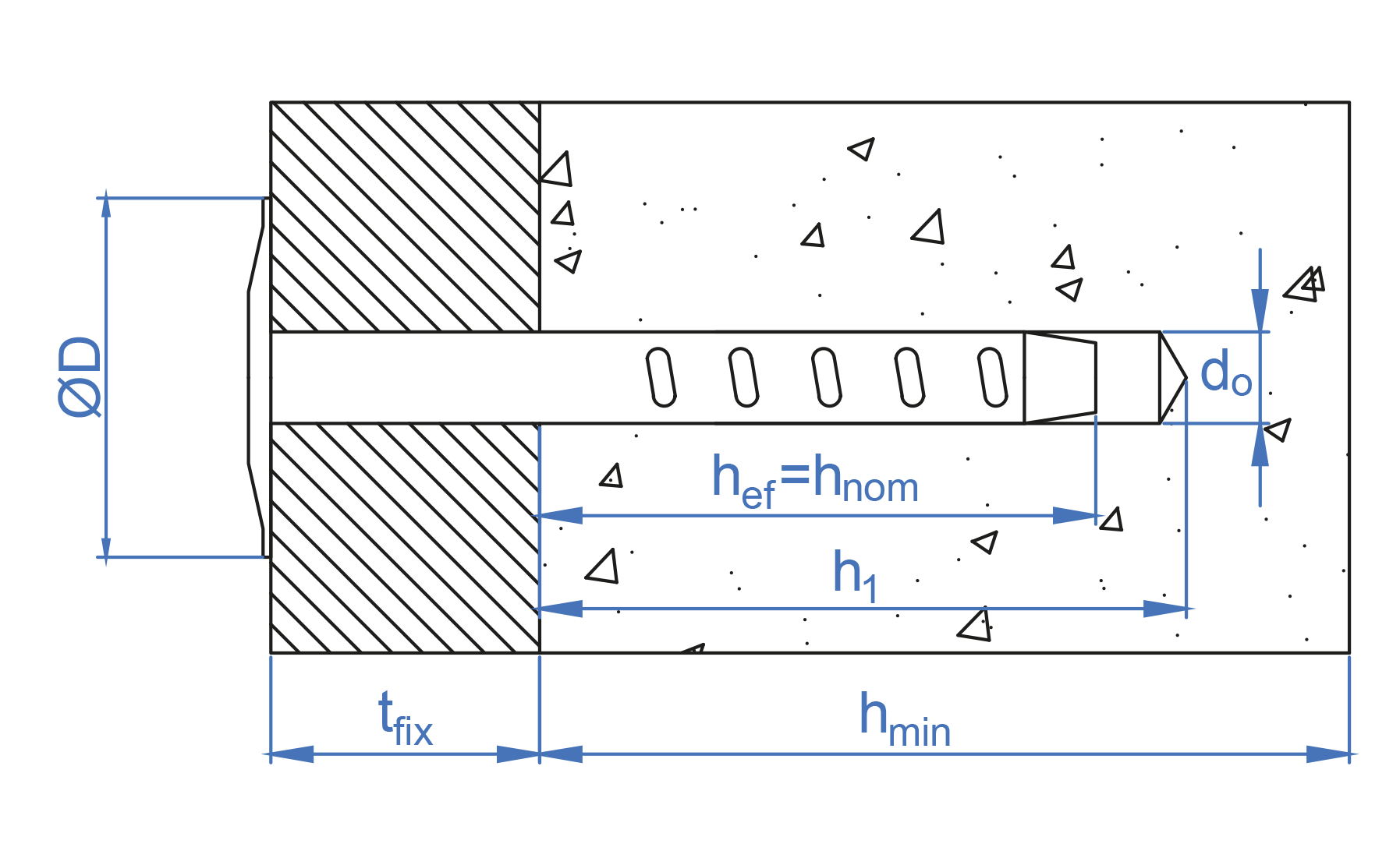 Medida: Ø8 x 300 L: 300 Prof. mín. Anclaje: 40 Prof. mín. de taladro: 50 Diámetro (mm): 35 Ø Broca: 8 Espesor mín. material base: 100 Espesor máx. a fijar: 260 Distancia min. entre ejes "B": 100 Distancia min. al borde "A": 100 M (”): 8 M x L: 8 x 300 Extracción hormigón no-fisurado: 10 Extracción hormigón fisurado: 10