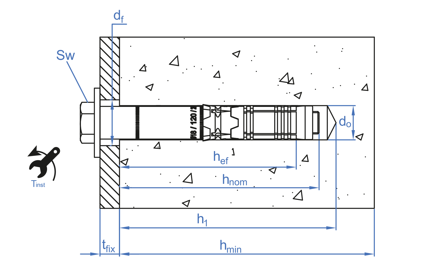 Medida: M16 x 170 Ø24 L: 170 Prof. mín. Anclaje: 117 Prof. mín. de taladro: 130 Profundidad efectiva: 100 Llave de instalación: 24 Par de apriete (Nm): 160 Ø Broca: 24 Ø Elemento a fijar: 26 Espesor mín. material base: 200 Espesor máx. a fijar: 50 Distancia min. entre ejes "B": 300 Distancia min. al borde "A": 150 M (”): M16 M x L: M16 x 170