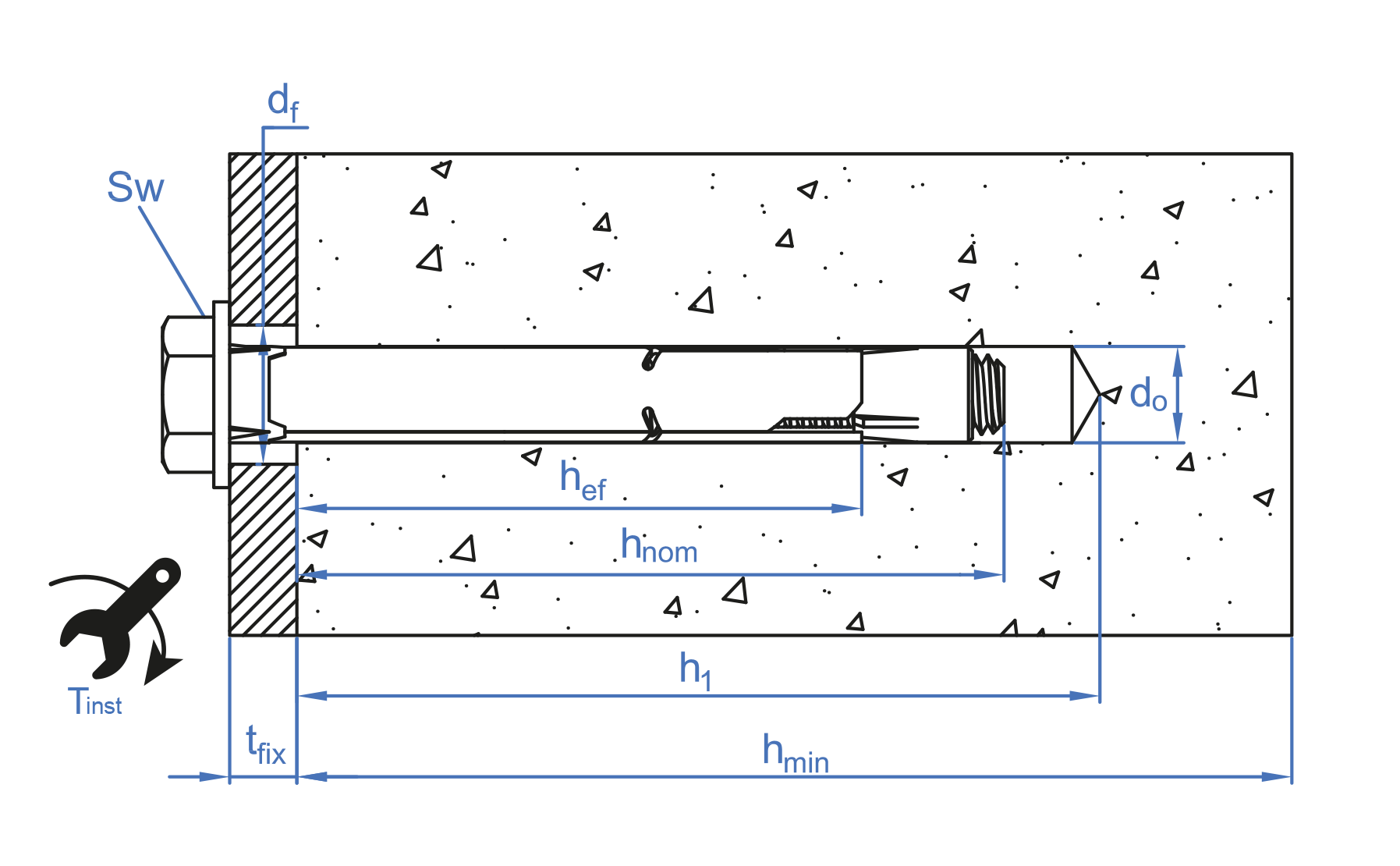 Medida: M8 x 60 Ø11 L: 60 Prof. mín. Anclaje: 51 Prof. mín. de taladro: 60 Profundidad efectiva: 40 Llave de instalación: 13 Par de apriete (Nm): 20 Ø Broca: 11 Ø Elemento a fijar: 13 Espesor mín. material base: 100 Espesor máx. a fijar: 5 Distancia min. entre ejes "B": 54 Distancia min. al borde "A": 54 M (”): M8 M x L: M8 x 60