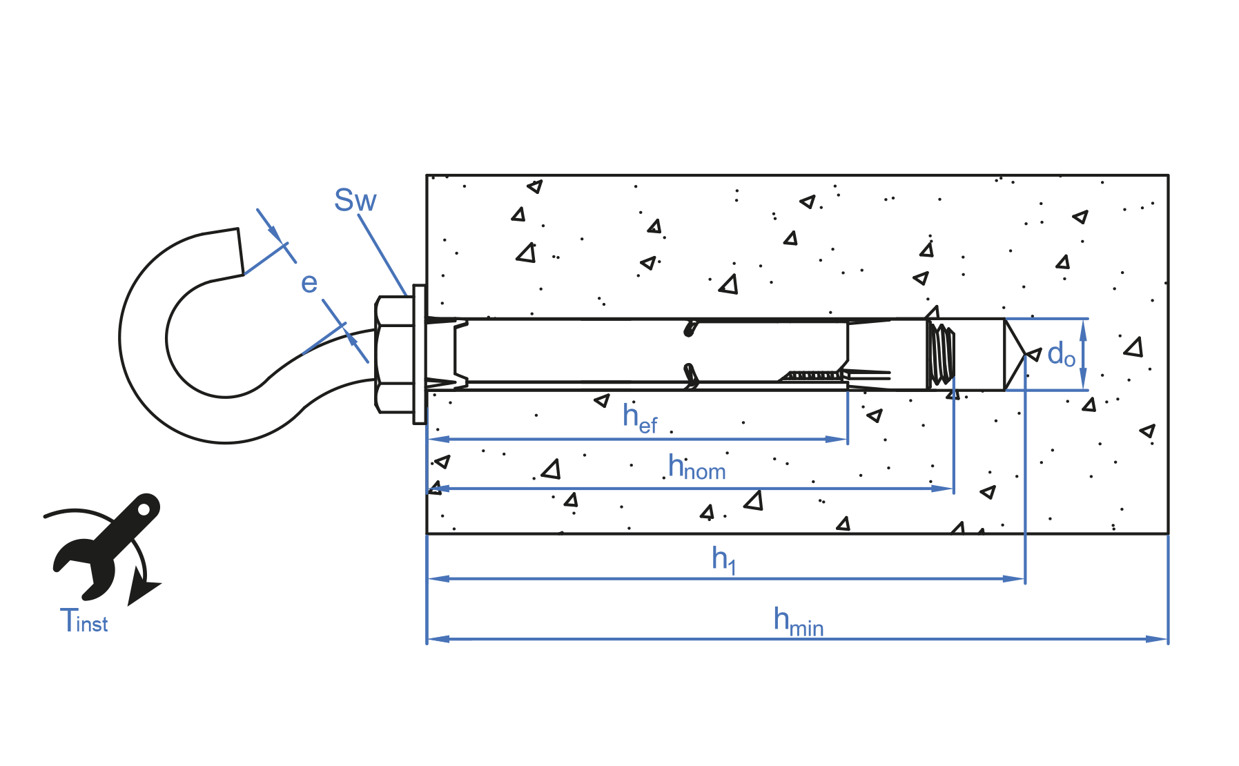 Medida: M8 x 60 Ø10 L: 60 Prof. mín. Anclaje: 51 Prof. mín. de taladro: 60 Profundidad efectiva: 45 Llave de instalación: 13 Par de apriete (Nm): 20 Ø Broca: 10 Ø Elemento a fijar: 12 Espesor mín. material base: 100 Distancia min. entre ejes "B": 54 Distancia min. al borde "A": 54 Abertura gancho: 11 M (”): M8 M x L: M8 x 60