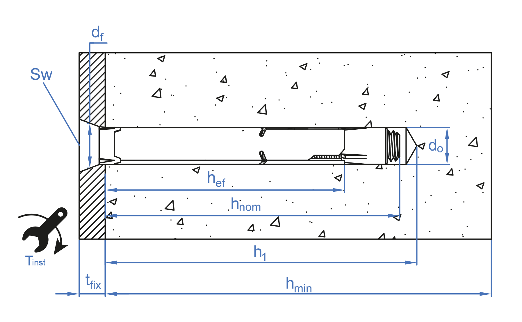 Medida: M10 x 70 Ø12 Nº Huella: 6 L: 70 Prof. mín. Anclaje: 65 Prof. mín. de taladro: 75 Profundidad efectiva: 48 Llave de instalación: 6 Par de apriete (Nm): 35 Ø Broca: 12 Ø Elemento a fijar: 14 Espesor mín. material base: 100 Espesor máx. a fijar: 5 Distancia min. entre ejes "B": 65 Distancia min. al borde "A": 65 M (”): M10