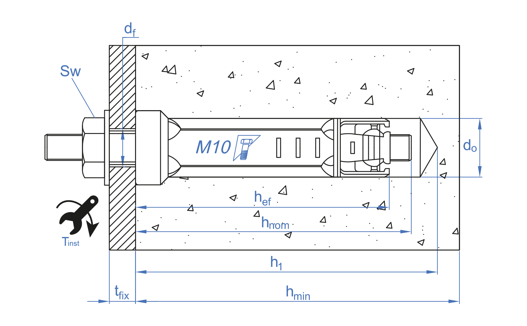 Medida: M10 x 60 Ø16 L: 60 Prof. mín. Anclaje: 60 Prof. mín. de taladro: 70 Profundidad efectiva: 60 Llave de instalación: 17 Par de apriete (Nm): 50 Ø Broca: 16 Ø Elemento a fijar: 12 Espesor mín. material base: 120 Espesor máx. a fijar: 8 Medida tornillo: 80 Distancia min. entre ejes "B": 180 Distancia min. al borde "A": 90 M (”): M10