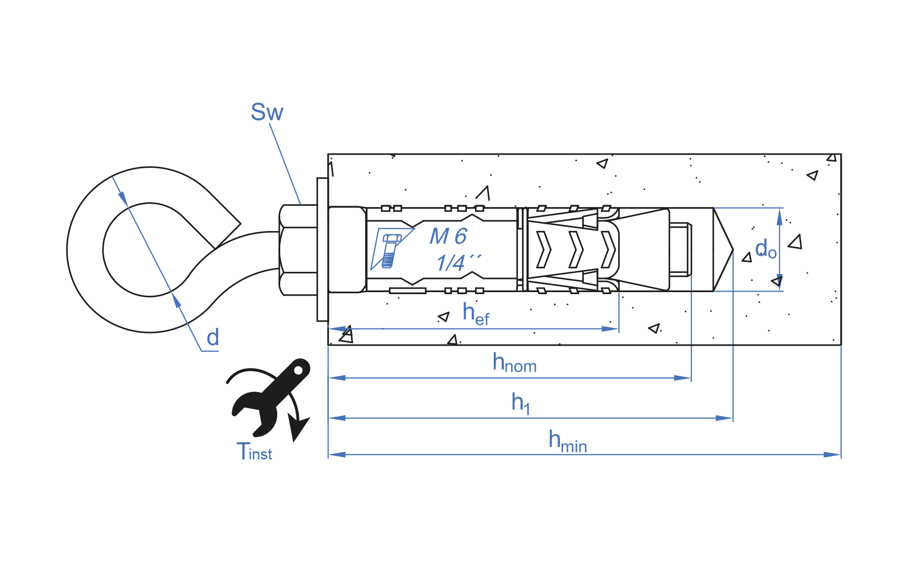 Medida: M10 x 56 Ø16 L: 56 Prof. mín. Anclaje: 58 Prof. mín. de taladro: 75 Profundidad efectiva: 51 Llave de instalación: 17 Par de apriete (Nm): 30 Ø Broca: 16 Ø Elemento a fijar: 12 Ø Ojo: 14 Espesor mín. material base: 102 Distancia min. entre ejes "B": 155 Distancia min. al borde "A": 80 M (”): M10 M x L: M10 x 58