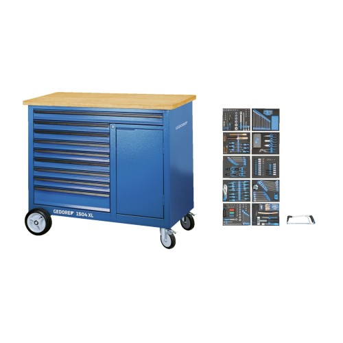 Para la industria, el artesanado o sector automovilístico, Herramientas en sistema métrico, Con el sistema Check-Tool de GEDORE: Comprobación de integridad mediante módulo de gomaespuma de 2 colores, Resistente a aceites y grasas, En el banco de trabajo No. 1504 XL, Tablero contrachapado de haya multiplexado de 30 mm de espesor, superficie protegida adicionalmente con barniz de aceite de linaza, Armario de gran tamaño con balda y puerta, Seguridad mediante la protección de los talones de las personas, Cierre centralizado con cerradura de cilindro, 1 cajón extra largo (AN 1055 x P 400 mm), 6 cajones anchos (AN 640 x P 400 mm) con extracción total, desmontables, Cerradura de seguridad por cajón, operación con una sola mano, Guías montadas sobre rodamientos de bolas, Capacidad de carga por cajón 40 kg, cajón inferior 60 kg, Capacidad de carga total 1000 kg, en servicio móvil 750 kg, 2 ruedas GEDORE de alto rendimiento con rodamientos de rodillos (ruedas fijas de Ø 200 mm), 2 ruedas GEDORE con cojinetes de bolas de marcha suave (ruedas giratorias de Ø 125 mm), ambas con freno total, El diseño especial del eje trapezoidal de GEDORE posibilita también en caso de carga máxima: marcha fluida, maniobrabilidad y seguimiento de rodadura, Ampliable gracias al panel trasero R 1504 XL-L, Dimensiones: H 985 x A 1250 x P 630 mm