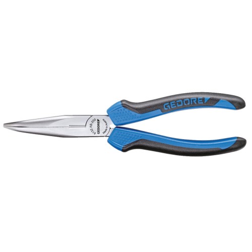 Similar a la DIN ISO 5745, Semiredondo plano, mandíbulas largas, superficies de agarre en ángulo, dentadas, Puntas acodadas en 45° para sujetar o coger cosas en zonas de difícil acceso, Filos de corte de precisión endurecidos por inducción, dureza del filo de corte 61 - 63 HRC, Acero bonificado especial GEDORE, forjado en estampa, templado al aceite y endurecido, Ejecución JC = cromada, funda del mango de 2 componentes, Versión TL = gris acero, con mangos antideslizantes de plástico azul sumergido, TC = cromado, con mangos bañados en azul