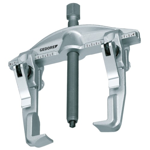 Para la extracción segura y rápida de discos, ruedas, rodamientos de bolas, etc., Fuerte, puente de forma ergonómica con refuerzo de momento de flexión, El puente diseñado ergonómicamente tiene pares de arrastre aún más fuertes y seguros debido al refuerzo del momento de flexión en la espalda, Escala de ajuste para el ajuste uniforme de las patas. Permite una tracción centrada y optimizada para la fuerza, incluso con las fuerzas de tracción más altas., El ajuste rápido apoya el método de trabajo ergonómico y rápido, Punta de husillo intercambiable (bola o punta)