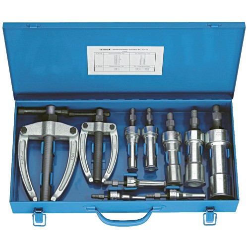 Conjuntos de los extractores internos y contra-poyos más comunes para extraer rodamientos, anillos, bujes, Simmerrings®, etc. En una sólida caja de chapa